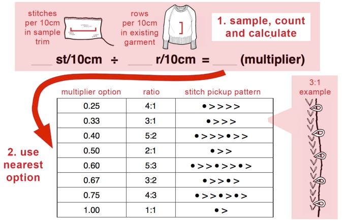 To ensure your new trim lays flat, you need to pick up stitches at the correct ratio. See the step 2 video above for an example of the chart below being used.